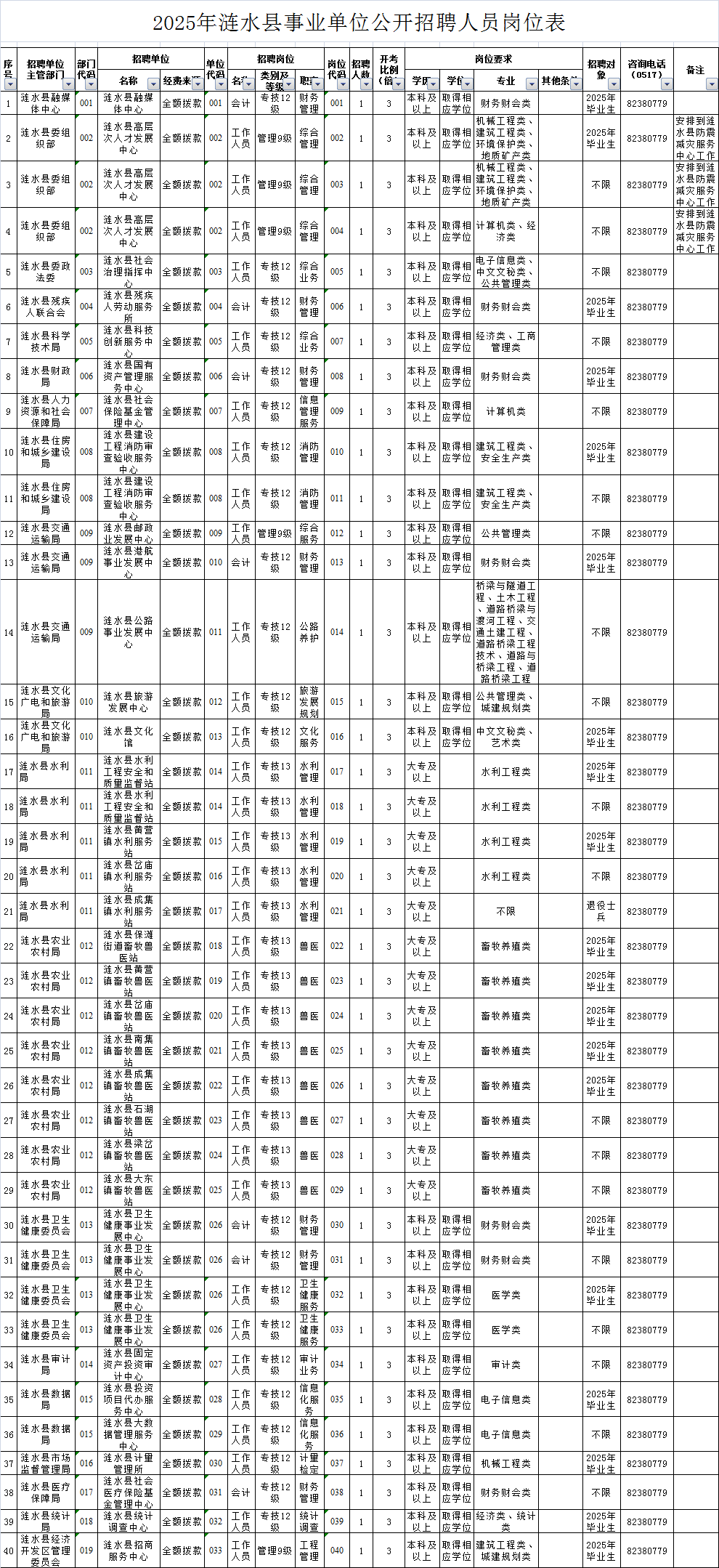 招聘单位、岗位、人数和相关要求详见《2025年涟水县事业单位公开招聘人员岗位表》(以下简称《岗位表》)。